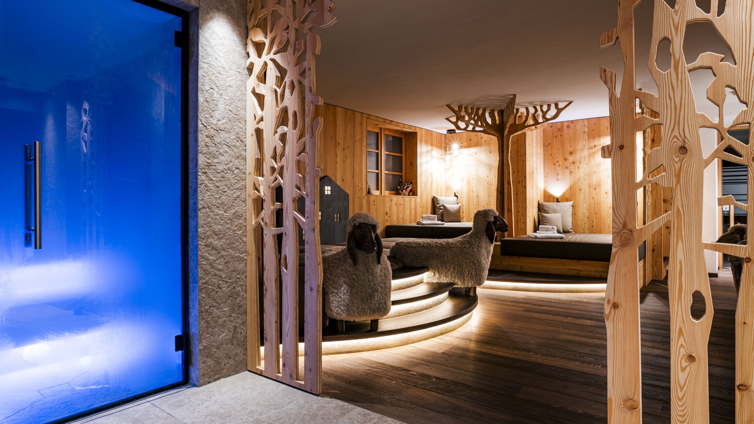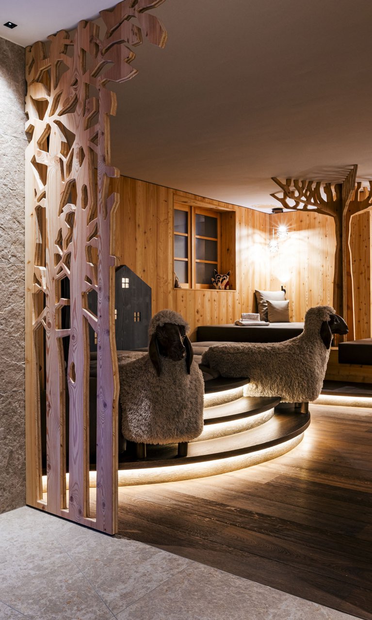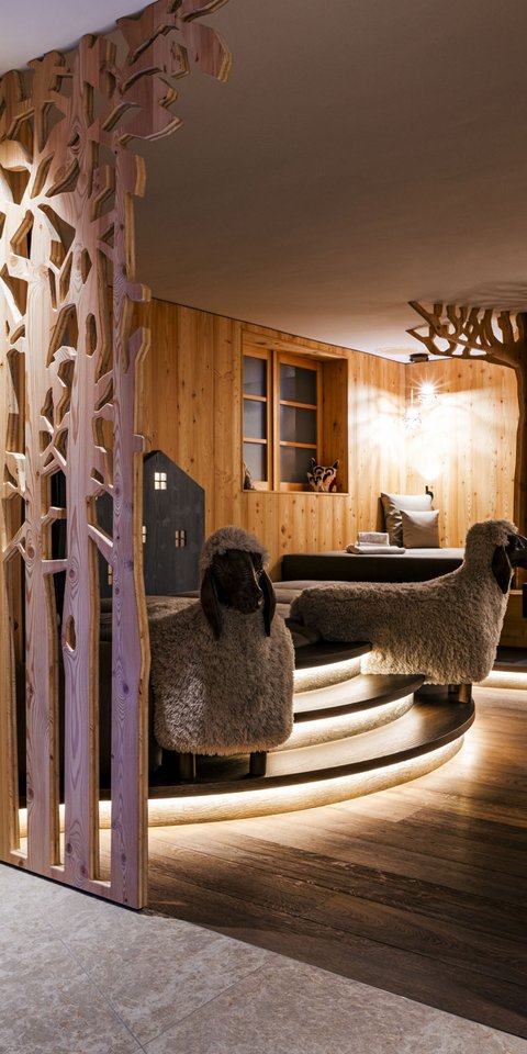 Here it is, the most popular sauna for families! In this wellness refuge, mum and dad can regenerate with their little ones in the steam bath and then take a break in the relaxation room with comfortable beds and sheep-shaped poufs. A warm and cosy atmosphere, the scent of wood and soft lighting: relaxing comes so naturally!